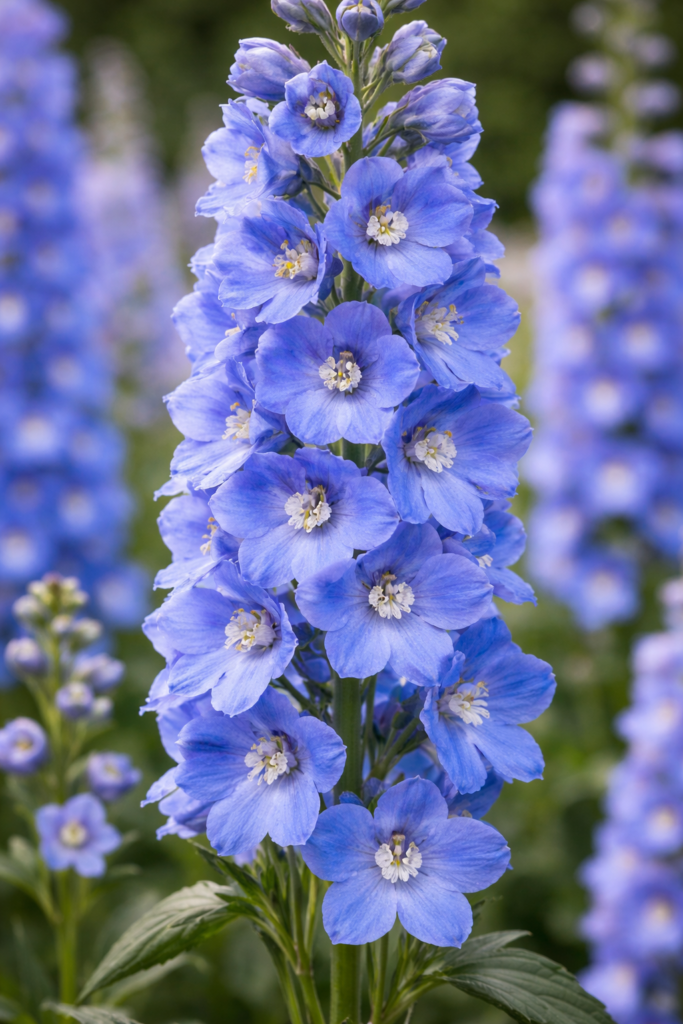 Delphiniums produce tall spikes covered with many beautiful flowers, making them perfect for garden backdrops.