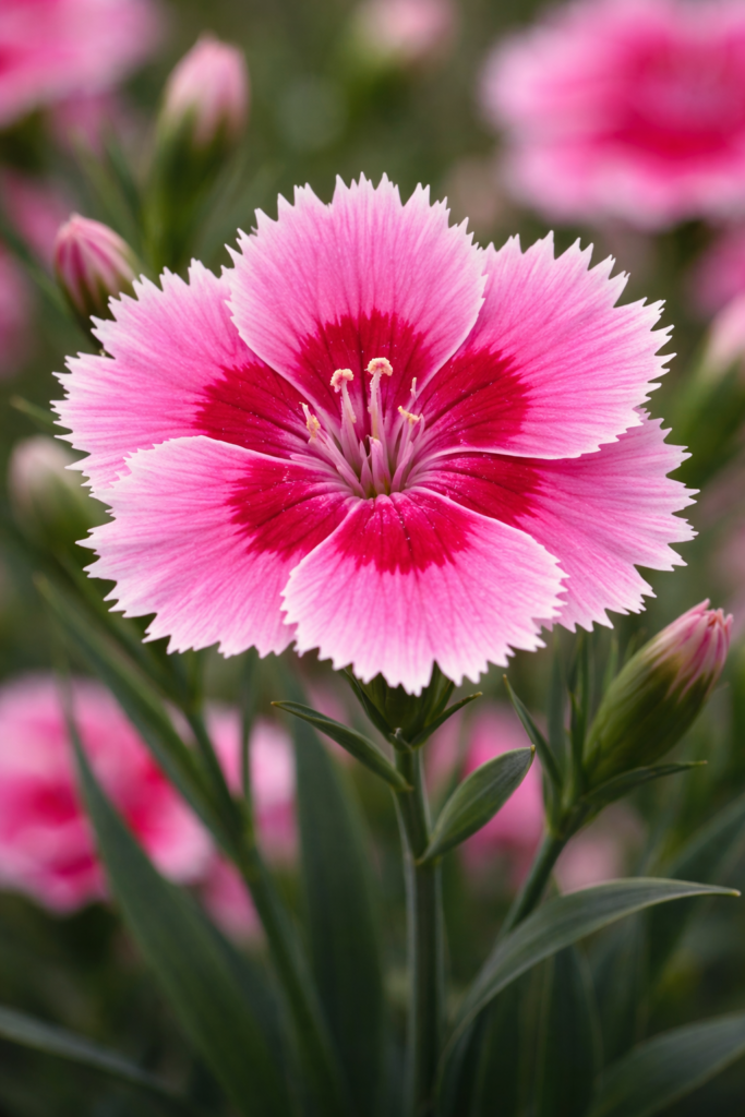 Dianthus flowers are small, fragrant blooms often called “pinks.” They are popular in borders and rock gardens.